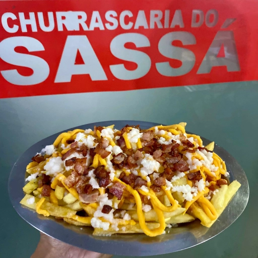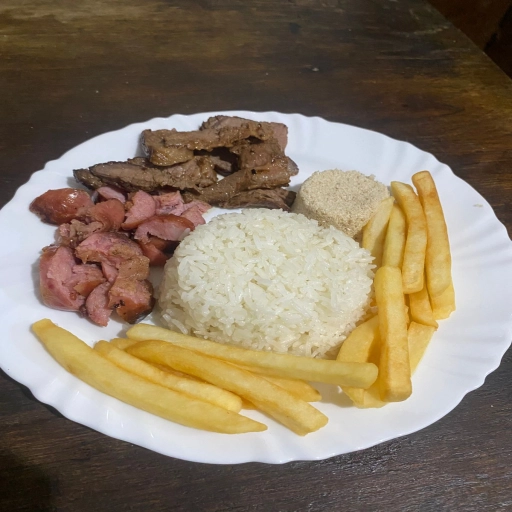 Carne bovina, linguiça, medalhão de frango, batata frita, arroz, molho vinagrete e farofa.