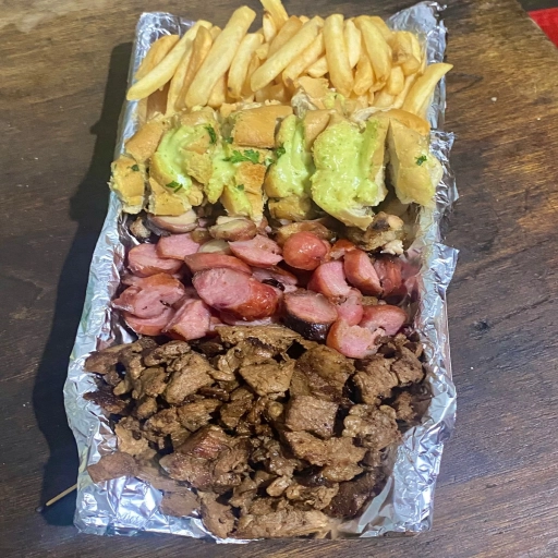 Carne bovina, linguiça, medalhão de frango, batata frita e pão de alho.
